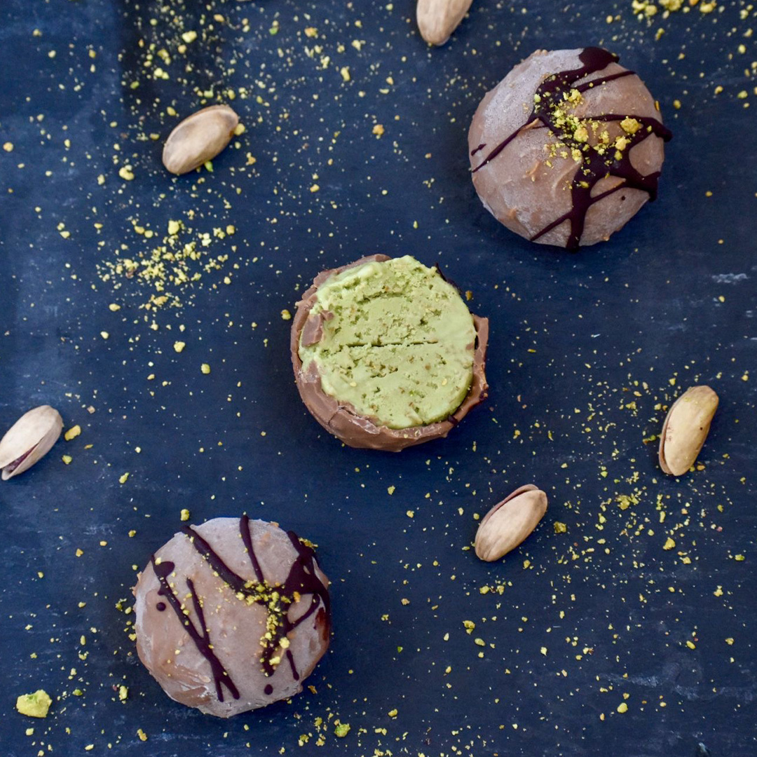 Die Basis bildet cremiges Pistazieneis, hergestellt mit 100 % echter Pistazie und regionaler Milch aus der Buckligen Welt (Niederösterreich). Die zarte Sensation ist gefüllt mit knusprigem Engelshaar und mit feinster Milchschokolade überzogen.